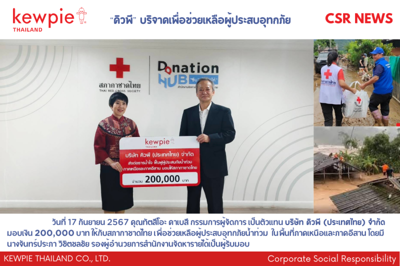 บริษัท คิวพี (ประเทศไทย) จำกัด มอบเงิน 200,000 บาท แก่สภากาชาดไทย เพื่อช่วยเหลือผู้ประสบอุทกภัย
