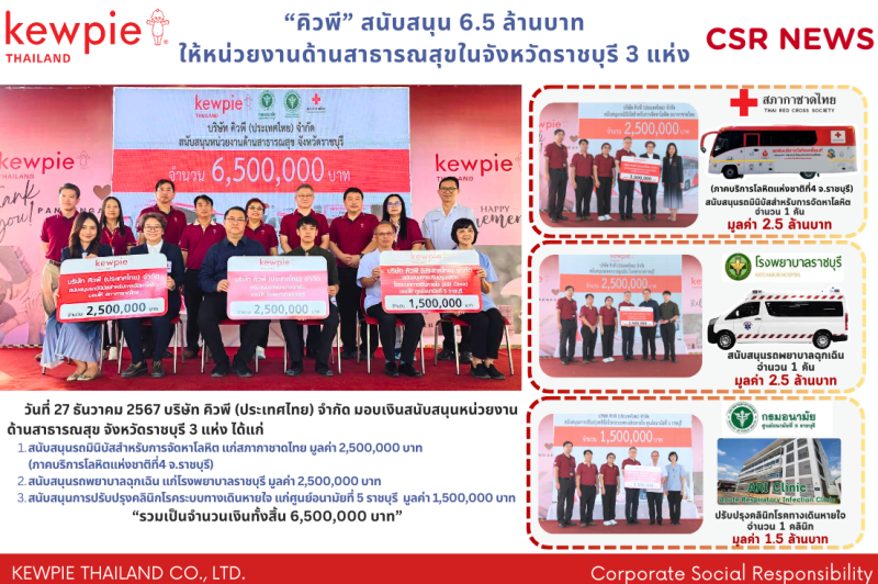 บริษัท คิวพี (ประเทศไทย) จำกัด สนับสนุน 6.5 ล้านบาท ให้หน่วยงานด้านสาธารณสุขในจังหวัดราชบุรี 3 แห่ง