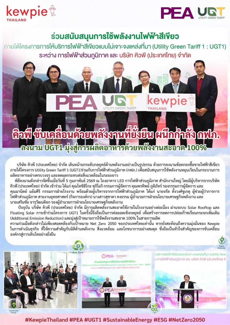 ความร่วมมือดังกล่าวไม่เพียงสอดคล้องกับเป้าหมาย Net Zero 2050 ของประเทศไทย เท่านั้น หากยังสะท้อนถึงความมุ่งมั่นของ Kewpie ในการดำเนินธุรกิจ ที่ให้ความสำคัญกับมิติด้านพลังงาน สิ่งแวดล้อม และโภชนาการอย่างสมดุล ซึ่งถือเป็นหัวใจสำคัญของการขับเคลื่อนองค์กรสู่การเติบโตอย่างยั่งยืน