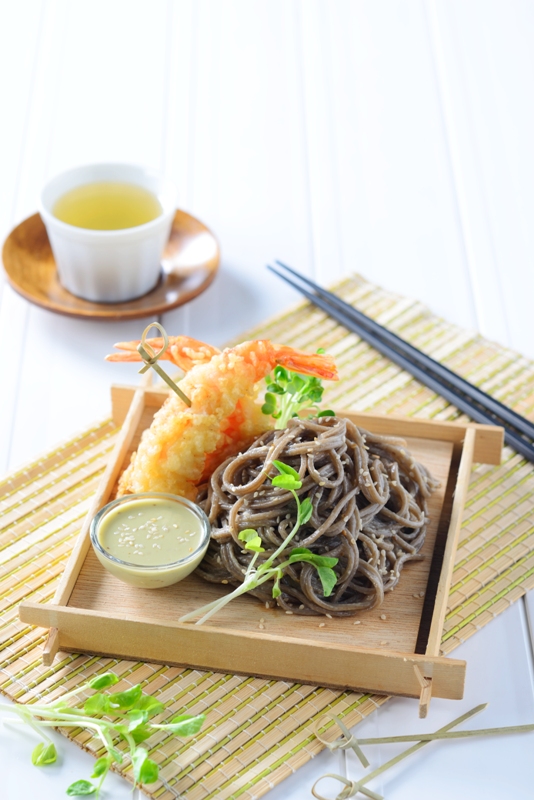 จัดเส้นโซบะใส่จาน ใส่ไควาเระ โตเหมี่ยว และกุ้งทอด จากนั้นผสมน้ำสลัดงาซีอิ๊วญี่ปุ่น ตราคิวพี และวาซาบิมายองเนส ตราคิวพีเข้าด้วยกัน เสิร์ฟพร้อมเส้นโซบะและกุ้งเทมปุระ